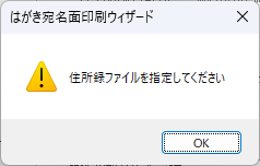WordとExcelで作成した住所録のファイルを紐づけていない場合は「住所録ファイルを指定してください」の警告画面が表示されます。