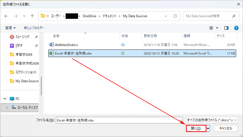 🥉手順⑨:Excelで作成した住所録ファイルを、保存しているフォルダーを開き(例:【Excel年賀状・住所録】)のファイルを選択し【開く】をクリックします。
