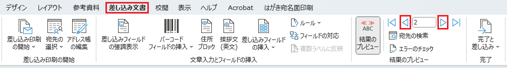 🥉手順①:Wordの『差し込み文書』タブを選択し『結果のプレビュー』グループ内の【▶】次のレコードまたは【◀】前のレコードをクリックすると、宛先を変更することができます。