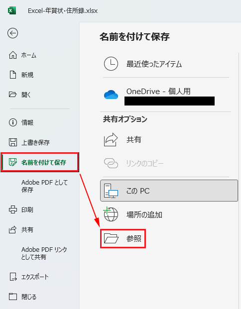 Excelで作成した年賀状の住所録は、任意の場所に保存します。