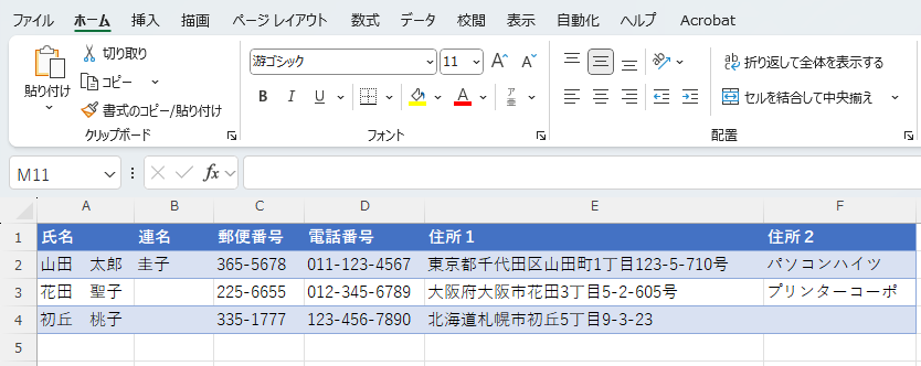 最初に、Excelを使用して年賀状の住所録を作成して、パソコン内に保存します。