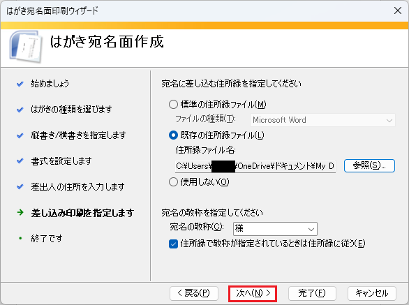 WordをExcelファイルの「紐づけ」が完了すると、次回からは下図の『差し込み印刷を指定します』の画面で【次へ】をクリックすると自動的に「宛名に差し込む住所録」が参照されます。