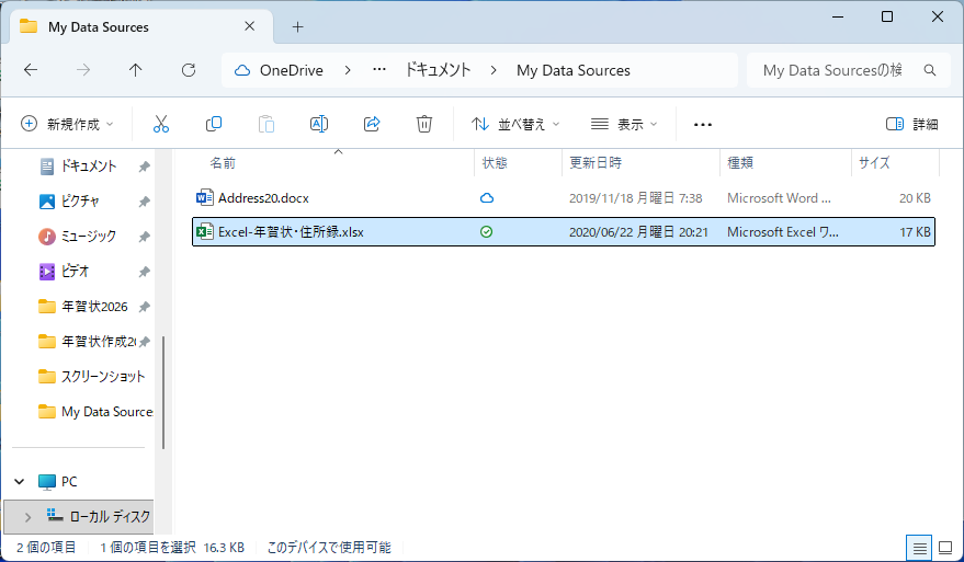 ■今回は例として、Excelで作成した住所録のファイルを、My Data Sourcesフォルダー内に保存しました。