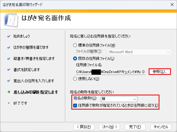 🥉手順⑧:左側ペインの『差し込み印刷を指定します』では『宛先に差し込む住所録』の一覧から【既存の住所録ファイル】を選択し【参照】をクリックします。