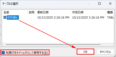 🥉手順⑫:テーブルの選択の画面が表示されましたら『先頭行をタイトル行として使用する』に☑チェックが入っていることを確認して、Excelのシート(例:【住所録$】)を選択し【OK】をクリックします。