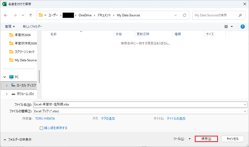 今回は、例として【ドキュメント】フォルダー内の【My Data Sources】に保存します。
