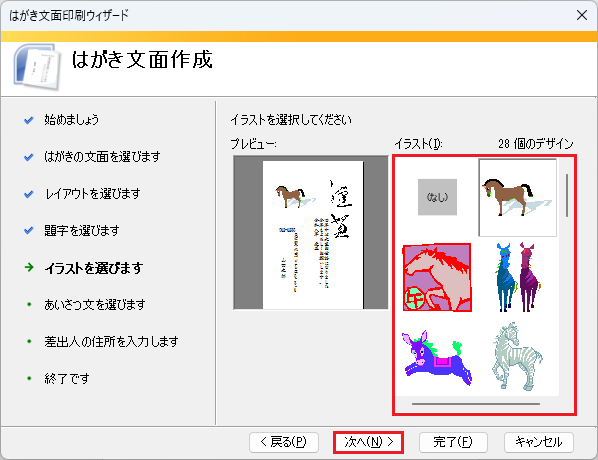 🥉手順⑤:『イラストを選びます』では【イラストのデザイン】任意のデザインを1つ選び【次へ】を選択します。