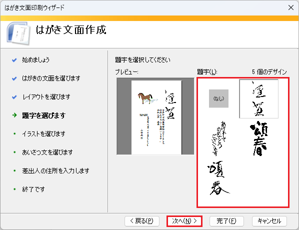 🥉手順④:『題字を選びます』では【題字の候補】から、任意の題字を1つ選び【次へ】を選択します。