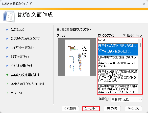 🥉手順⑥:『あいさつ文を選びます』では、あいさつ文の一覧から任意の【あいさつ文】を1つ選び【次へ】を選択します。