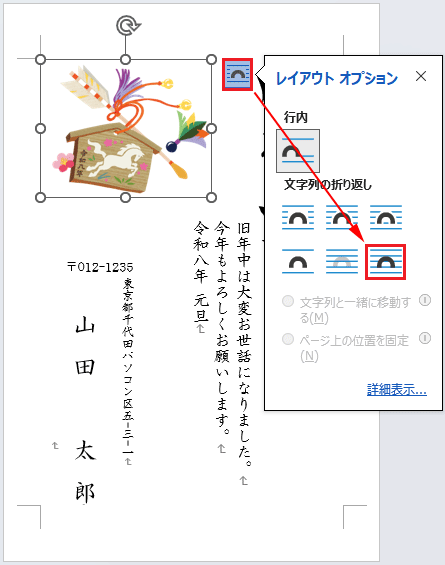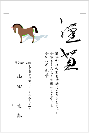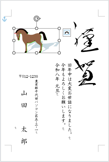 Wordで作成した年賀状は【題字】【イラスト】【あいさつ文】は全て図形になっていますので、個別に編集して任意のデザインに変更することができます。