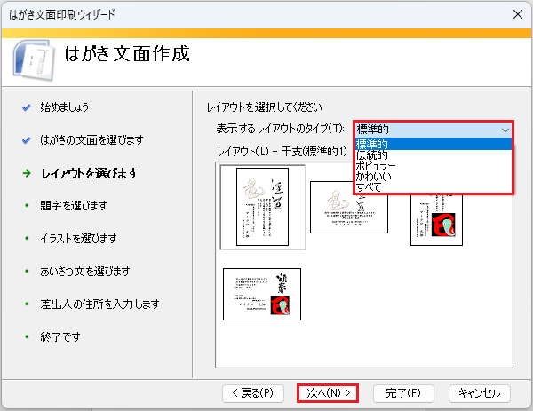🥉手順②:『はがきの文面を選びます』では【年賀状】を選択して【次へ】を選択します。
