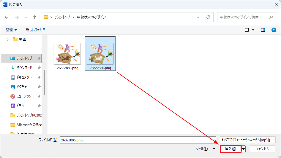 🥉手順④:パソコンの画像を保存してあるファイルの中から、任意のイラスト(画像)を1つ選び【挿入】を押します。