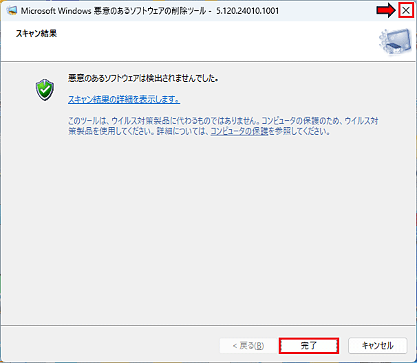 🥉手順④:悪意のあるソフトウェア削除ツール(MSRT)を、タスクバーにピン止めしましたらスキャンが完了している場合は【完了】をクリック、起動直後は【×】ボタンをクリックしてMSRTを閉じます。