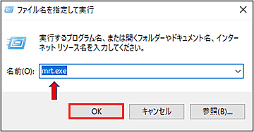 🥉手順①:キーボードの【Win】+【R】を押して『ファイル名を指定して実行』を呼び出し『検索ボックス』に【mrt.exe】と入力して【OK】をクリックします。