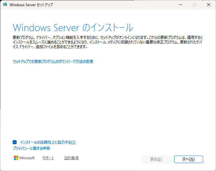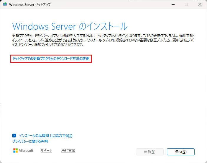 🥉手順⑭:『Windows Serverのインストール』画面が表示されましたら【セットアップの更新プログラムのダウンロード方法の変更】をクリックします。