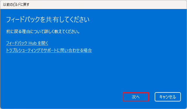 🥉手順⑥:『フィードバックを共有してください』が表示されましたら【次へ】をクリックします。