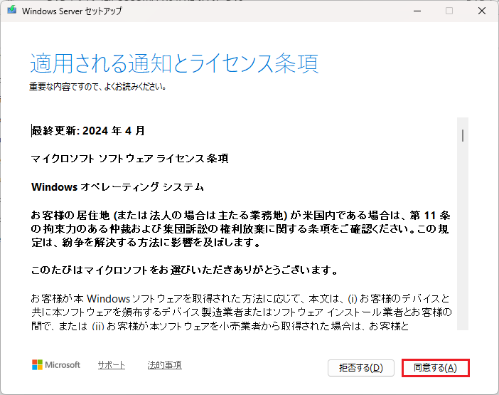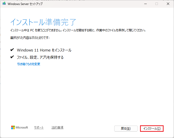 「Windows Serverのインストール」と表示されていますが、Windows11がインストールされますので、ご安心ください。