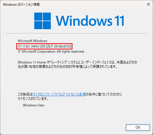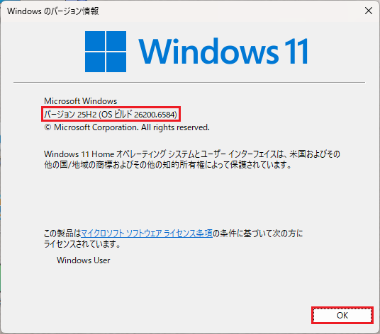 🥉手順③:Windows11のバージョン25H2が適用されていることを確認して【OK】をクリックして画面を閉じます。