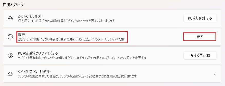 Windows11 25H2への機能更新から10日以内であれば、以前のWindows11のバージョンに戻すことができます。