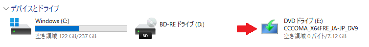 PCの「デバイスとドライブ」の一覧に作成された仮想DVDドライブにISOファイルが読み込まれていることを確認します。