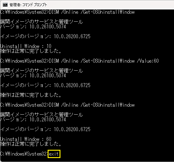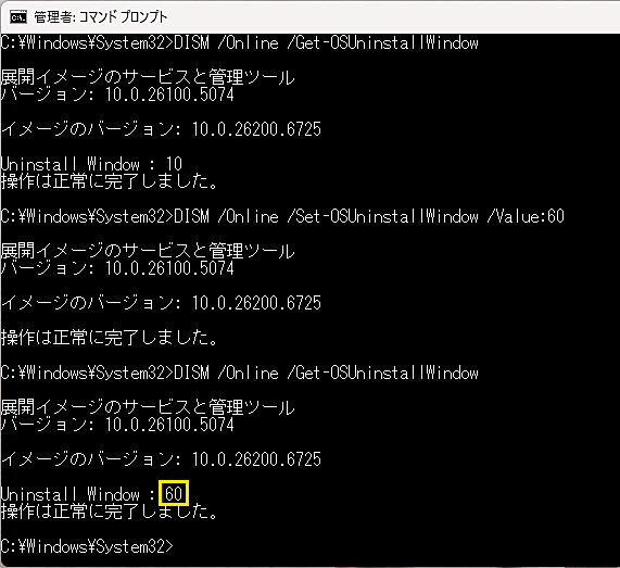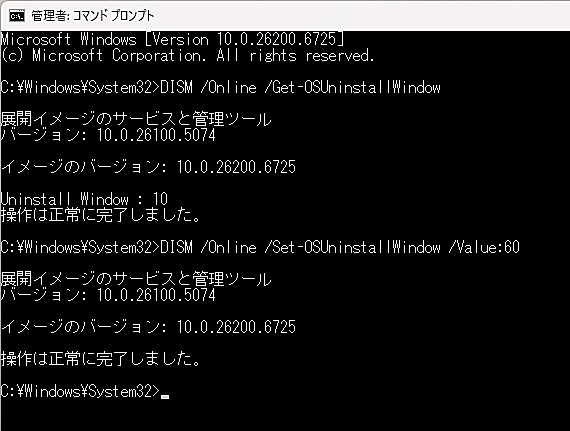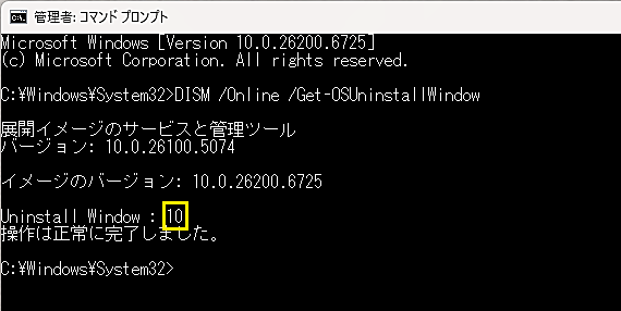 ☘️入力例 ➡ DISM(半角スペース)/Online(半角スペース)/Get-OSUninstallwindow(半角スペース)/Value:60