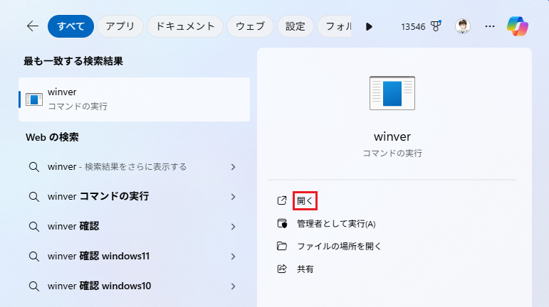 🥉手順②:検索結果に『winver』が表示されましたら【開く】を選択します。