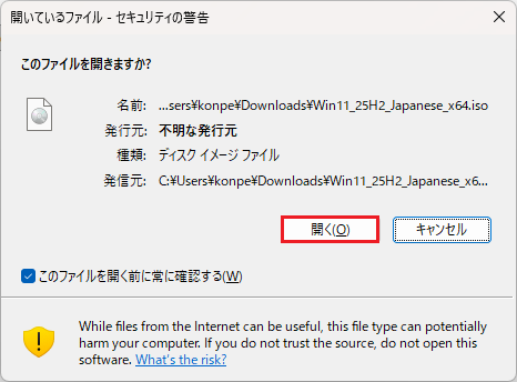 🥉手順⑦:『開いているファイル-セキュリティ警告』の画面が表示されましたら【開く】をクリックします。