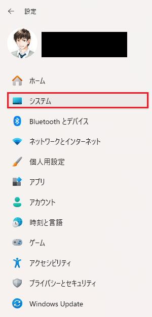 🥉手順③:『設定』が表示されましたら、左側ペインの【システム】を選択します。
