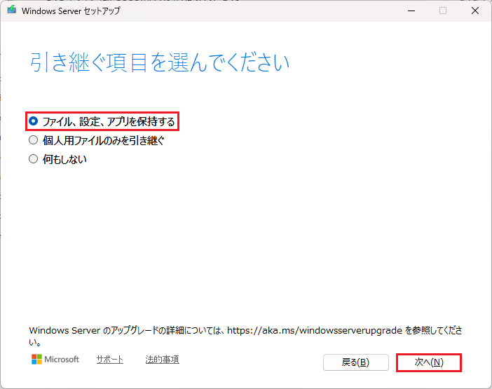 🥉手順⑰:『引き継ぐ項目を選んでください』の画面が表示されましたら【ファイル、設定、アプリを保持する】を選択し【次へ】をクリックします。