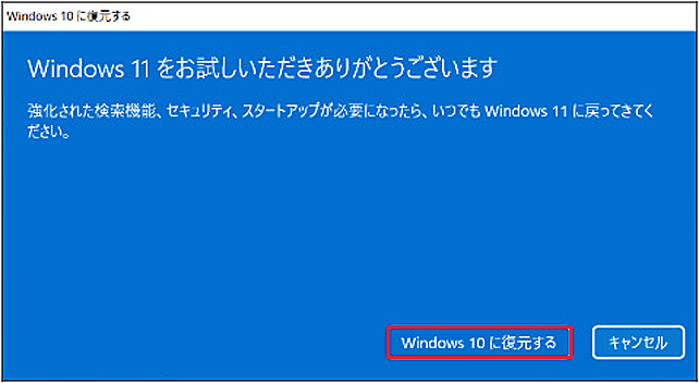 ■Windows10からWindows11【25H2】にアップグレードした後に、Windows10に戻す場合は【Windows10に復元する】を選択します。
