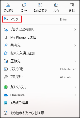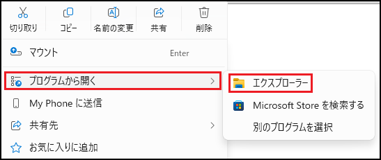 コンテキストメニューに「マウント」が表示されていない場合は、コンテキストメニューの一覧から『プログラムから開く』を選択し【エクスプローラー】をクリックします。