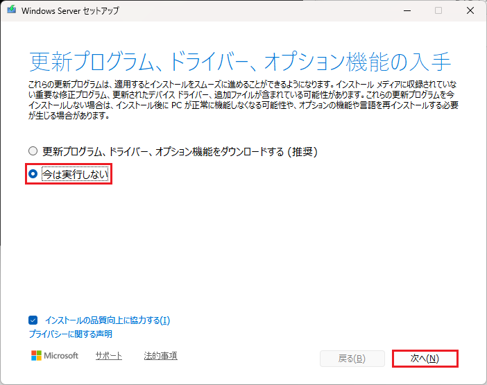 🥉手順⑮:『更新プログラム、ドライバー、オプションの入手』の画面が表示されましたら【今は実行しない】を選択し【次へ】をクリックします。