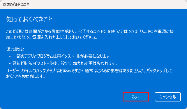 Windows11のバックアップを作成しておくと、パソコンに不具合が発生した時にWindows11を「以前のビルド」に戻すことができます。