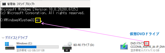 🥉手順⑪:コマンドプロンプトが起動しましたら、PCの「デバイスとドライブ」の一覧に作成された仮想DVDドライブの「ドライブ文字」と同じ値と「コロン」(例【e:】)を、半角英数字で、コマンドプロンプトに入力し、キーボードの【Enter】キーを押します。
