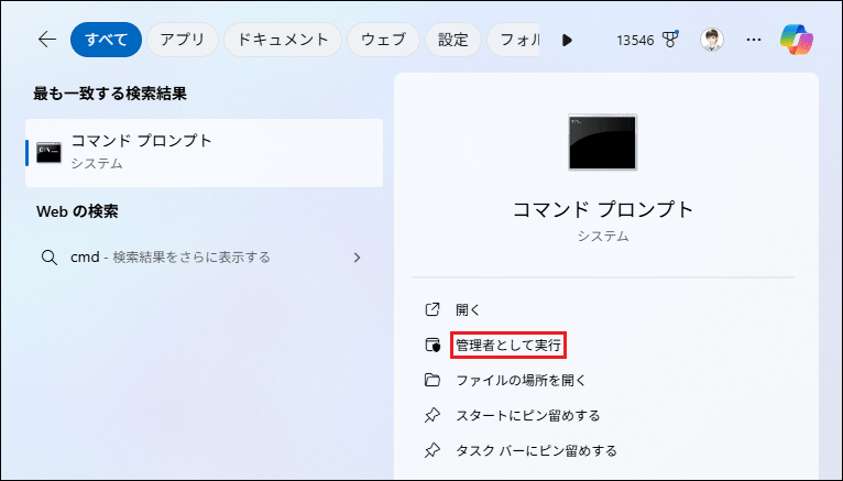 🥉手順②:検索結果にコマンドプロンプトが表示されましたら【管理者として実行】をクリックします。