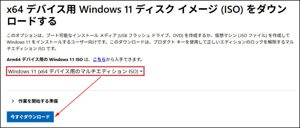 🥉手順②:「Windows11のダウンロード」サイトにアクセスしましたら『×64デバイス用Windows11ディスクイメージ(ISO)をダウンロードする』の項目のプルダウンリストを展開し【Windows11(×64デバイス用のマルチエディションISO)】を選択して【今すぐダウンロード】をクリックします。