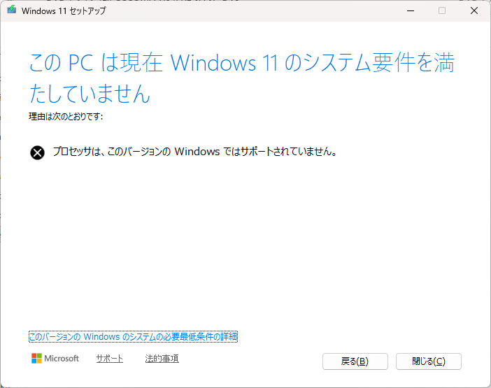 非対応PCに、Windows11 25H2のインストールを試みましたが、CPUの要件を満たしていないためWindows11をインストールすることができませんでした。