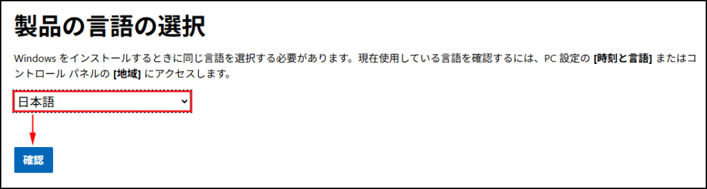 🥉手順③:『製品の言語の選択』の画面が表示されましたら、プルダウンリストを展開し、言語を【日本語】に指定して【確認】をクリックします。