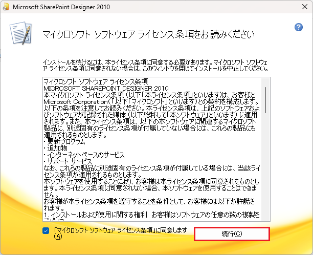 🥉手順④「マイクロソフト ソフトウェアライセンス条項」に同意します・・・に、☑チェックマークを入れ【続行】をクリックします。