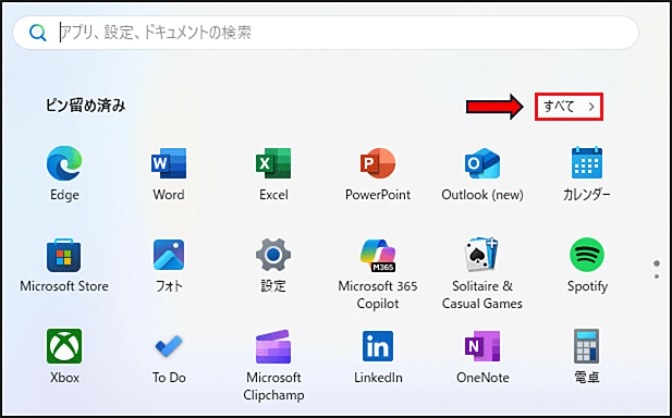🥉手順②:スタートメニューが表示されましたら【すべて>】を選択します。