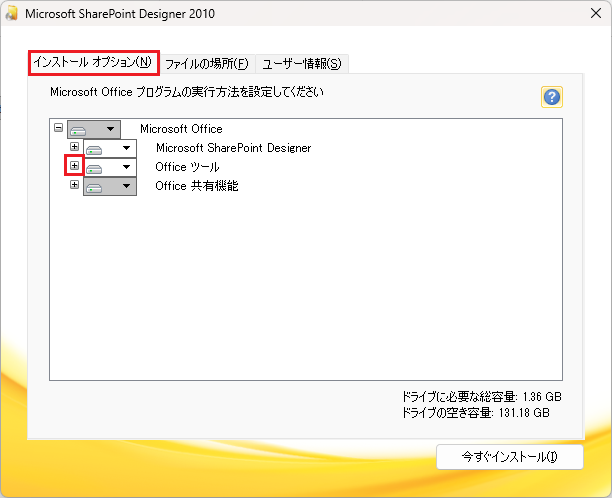 🥉手順①:Microsoft SharePoint Designer 2010の画面が表示されましたら『インストールオプション』タブの一覧にある【Officeツール】の左側の【+】ボタンをクリックして、リストを展開します。