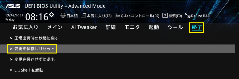 - STEP3BIOSの設定を保存し終了する