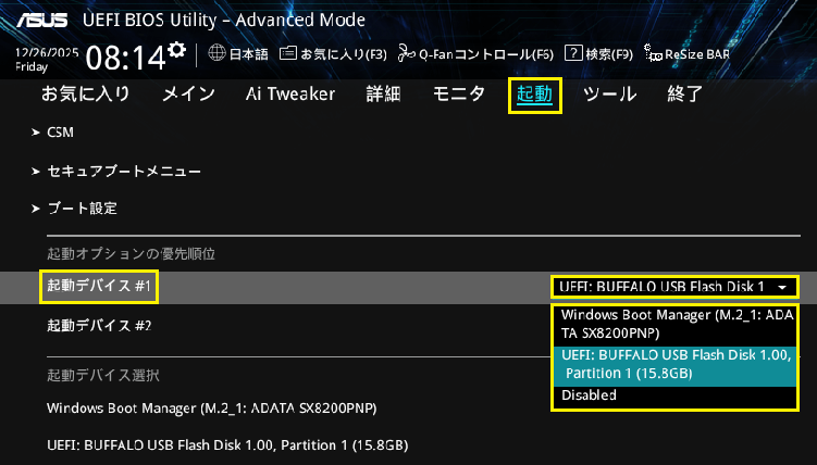 ■今回は例として起動デバイスの1番目に「UEFI:BUFFALO USB FLash Disk 1.00 Partition 1」を選択しています。