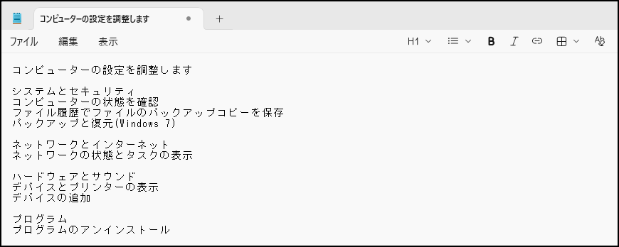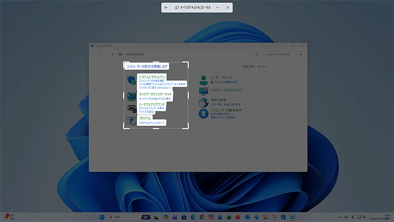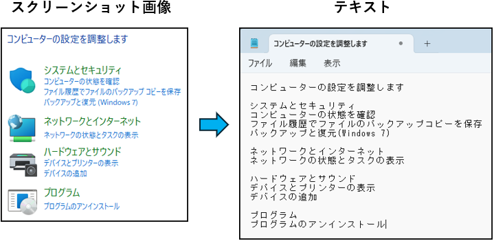 ■コントロールパネルのスクリーンショット画像から文字を抽出して、メモ帳にコピーすることができました。