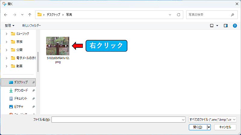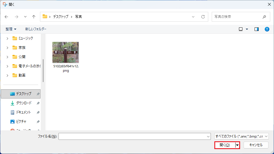 🥉手順④:保存済の写真や画像の中から、文字を抽出したい写真または画像を選択し【開く】をクリックします。