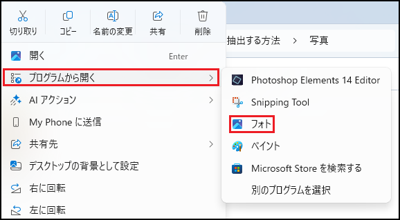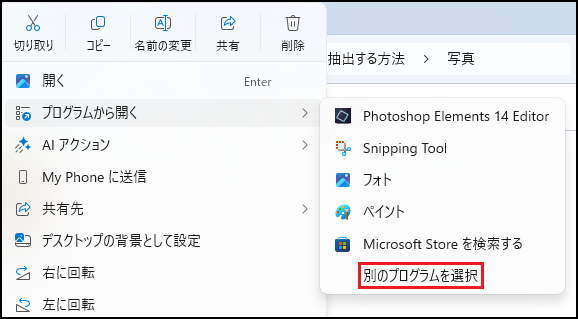 サブメニューの一覧にフォトアプリがない場合は【別のプログラムを選択】をクリックして、表示された一覧からフォトアプリを選択します。