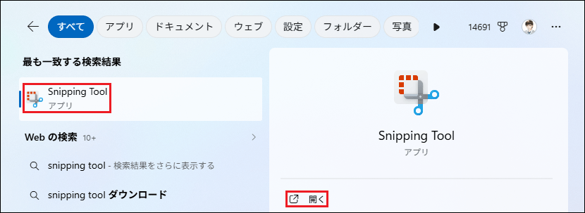 🥉手順②:検索結果の一覧から【Snipping Tool】または【開く】をクリックします。